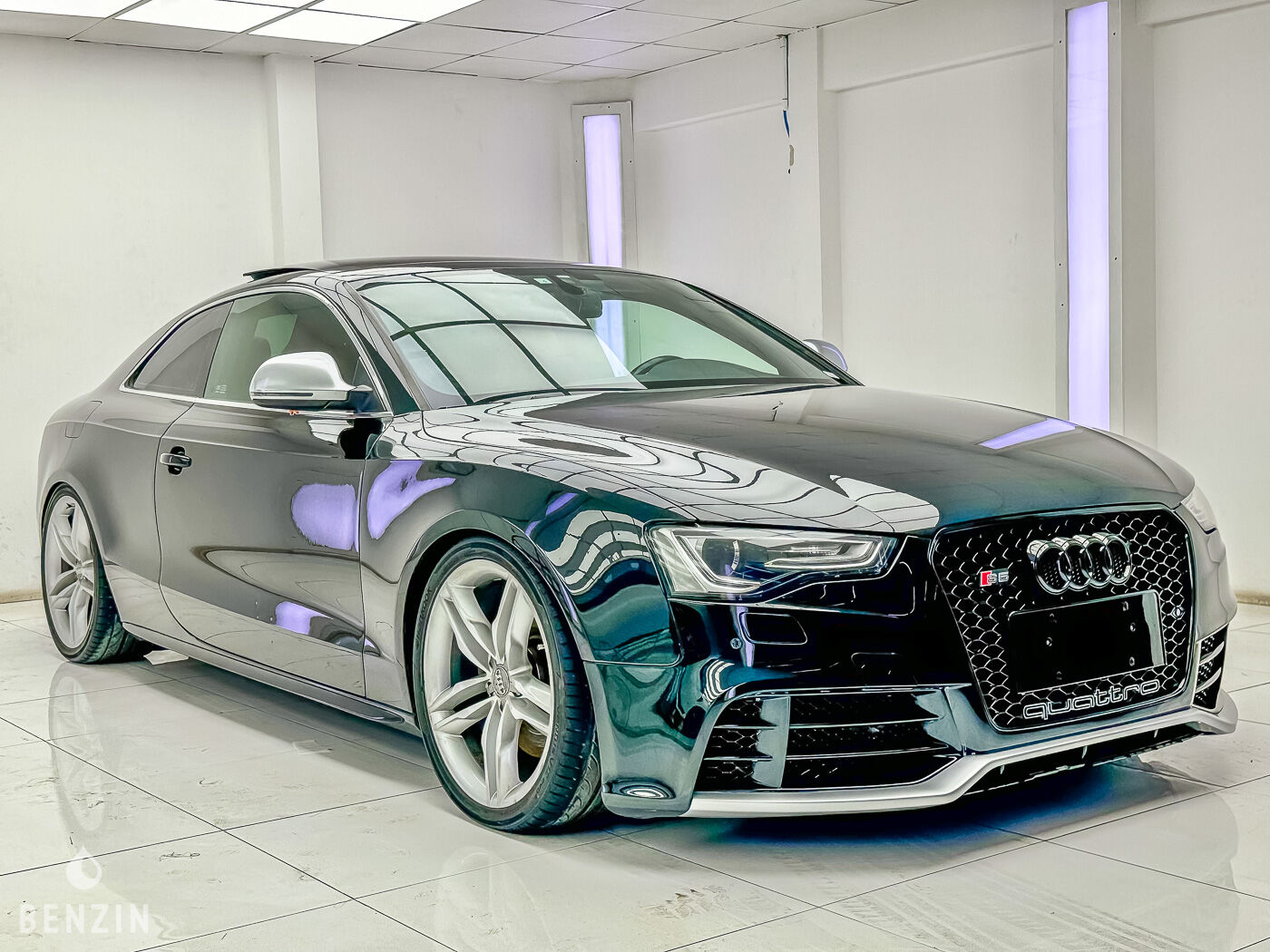 On the outside, the seller says that the vehicle is in very good condition. The bodywork, in its black colour, has only a few blemishes that can be seen in the gallery. The car has an Audi RS5 front bumper.