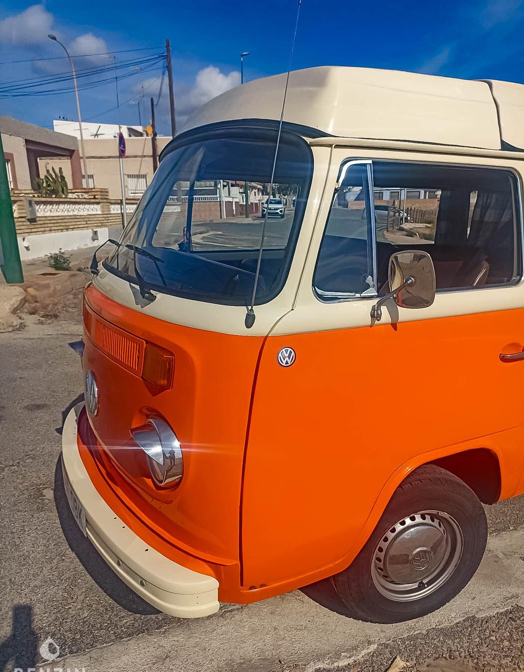 On the outside, the seller says that the vehicle is in good condition. The orange bodywork has only a few defects, which can be seen in the gallery. Photos of the underbody are available in the gallery. This Combi has a folding roof in good condition.